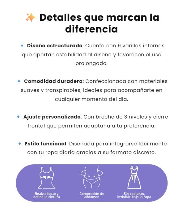 Nuestra cinturilla de 9 varillas está diseñada para brindar una sensación de ajuste firme y cómodo. Gracias a sus materiales de alta calidad, ofrece soporte, favorece una postura más cómoda y se adapta fácilmente a diferentes estilos de outfit. Ideal para usar en casa, trabajo o en tu rutina diaria.